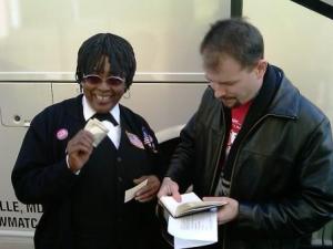 Interested and excited to see how this goes from the other side of the table, I stop and meet Theresa. She is a 24-year-old Maryland transplant from Wisconsin. It is bitter cold out and she says that her Wisconsin heritage prepared her well for just such a day.