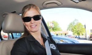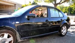 Doris driving my Jetta. You can't see it well, but VolksWerks is in the background. (photo: Reed)