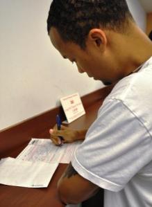 Chad filling out one of the many forms they give you. (photo: Reed)