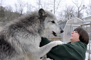 Today's recipient Kathy gets a hug from one of the wolves. (photo: Melinda T.)