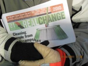 He spoke of getting caught panhandling without a permit which has a fine of $154, he went to court and his punishment was making him wait 1 year to get a panhandling permit so he is still on the streets with no permit. He says he has figured out the best place to stand where he can see in all directions and if he sees the police he folds his sign up and walks away, so far this tactic has worked for him.