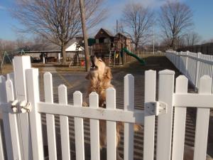 Outside the building is a 2 acre area which is sectioned off into different yard type areas for the dogs to play.  Outside I was greeted by Connor who is currently going through training.  Connor was playing in the area which was made up to look like a typical backyard area with swings and play-sets.  During the warmer months the children can spend time outside interacting with the dog.