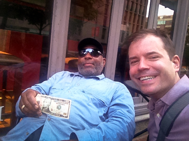 Thomas grew up in Washington and we figured out that we knew a few people in common. He knew Elijah from Day 185 and Connie from Day 319 of my Year of Giving. I asked him what he was going to with the $10 and he said he was going to probably get some food, band-aids and maybe put a few dollars in the cup of a street musician who was filling the air with the melodic riffs of a guitar.